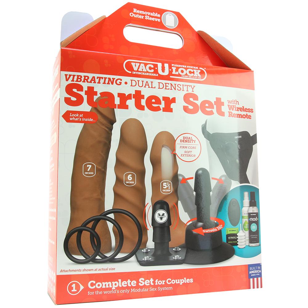 Let’s talk about those plugs! Aside from working with any standard Vac-U-Lock plug, this set comes with the Deluxe 360 Swivel Suction Cup Plug and a vibrating version of the classic plug complete with wireless remote. The Swivel allows more control over angle and position in harness OR against any smooth non-porous surface (thanks to the suction cup) and the vibrating plug, well, vibrates! You’ll be able to cue up 7 modes of vibration with a button on the base of the plug, or using the included wireless remote. The plug itself is USB rechargeable and the remote requires a CR2032 cell battery, which is included.
